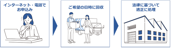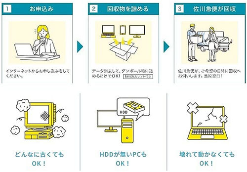 組合と連携・協力事業者であるリネットジャパンリサイクル株式会社が宅配便による回収を行います。パソコン本体を含む1箱分(3辺の合計が140㎝以内、重さ20㎏以内)の回収料金が無料になるとともに、他の小型家電も一緒に回収してくれます。